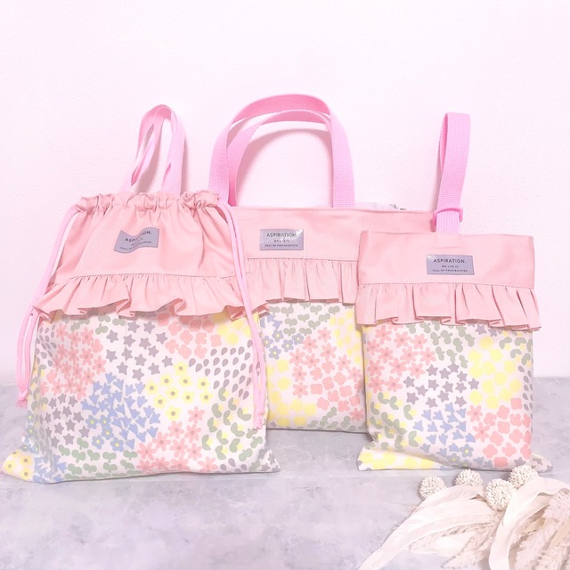 ご覧いただきありがとうございます(*´꒳`*) ⚠️こちらは【受注生産】になります。 納期についてのページをご確認いただき、 ご了承の上ご購入をお願いいたします❣️ ※お日にちに余裕を持ってご注文をお願いします。 〜3点セット〜 単品よりお安くなっています♪ Sweet Ribbonシリーズ♡ 華やかで優しい色合いの花柄生地を、 リボンアップリケに刺繍しております^ ^ 大人可愛いお洒落なデザインで、 周りのお友達から一目おかれちゃいます♡ こちらの生地は【オデッタ】 くすみカラーが大人可愛い、 大小の花が生地いっぱいに咲いたお花畑のようなデザイン。 ➖製品サイズ➖ 【レッスンバッグ】 ヨコ 約40cm タテ 約30cm(持ち手は含みません) マチなし フリルは表面のみ ※多少の誤差は御座います 【上履き入れ】 ヨコ 約22cm タテ 約28cm(持ち手は含みません) マチなし フリルは表面のみ ※多少の誤差は御座います 【体操着入れ】 ヨコ 約30cm タテ 約35cm(持ち手は含みません) マチなし フリルは表面のみ ※多少の誤差は御座います ➖素材➖ 表 ピンク→ツイル生地 花柄→ブロード+接着芯 裏 ピンク→ツイル生地 持ち手→アクリルテープ ----------------------------------------------------- 〜maaaruinoのこだわり〜 当SHOPでは一つ一つ手作りにて、 心を込めて丁寧にお作りしております ▪️安心の裏地つき ▪️見えない所でも布端の処理はしっかりと ▪️持ち手は4重で縫い止め十分に補強 お気に入りは、 長く持ちたいですよね(*´ー`*) 度重なるお洗濯にも強いと、お客さまからも ご好評いただいております^ ^ ----------------------------------------------------- 【ご購入前に確認お願いします】 ⭐︎BASE出店記念⭐︎ 送料一律200円キャンペーン中です(๑˃̵ᴗ˂̵) ◇一つ一つ丁寧に作成しました、 ハンドメイド品となります。 裁断の場所により、柄の出方も一つずつ 違うため、ご指定はお受けできません。 ◇モニターの設定や照明などご覧になる環境 によって実物と色が異なる場合があります。 ◇ 折り畳んでの発送となります。 ----------------------------------------------------- ※他のサイトにも出品中にて、突然削除する可能性あります。ご了承くださいませ。